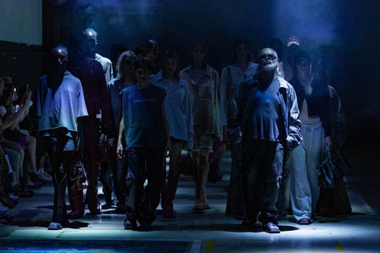 会場は62 Avenue de la Republiqueにある、現在は使われていない立体駐車場。靴職人から本格的なファッションブランドへの進化を象徴する場となりました。光が影から時間を借りる世界を舞台に、スモーキーで薄暗く、蛍光灯が灯る空間で展開され、ディストピアとユートピアが同時に織りなす幻想的な雰囲気は、見る者を一瞬にして別世界へと誘います。青い駐車ディスクという日常的なアイテムの招待状が、コンクリートに包まれたガレージの狂気的な舞台と物語を繋ぎます。メイクはInge Grognard、ヘアスタイリングはLouis Ghewyが手掛け、エンジンオイルに染まり汗にまみれたキャラクターたちがムードを盛り上げます。
