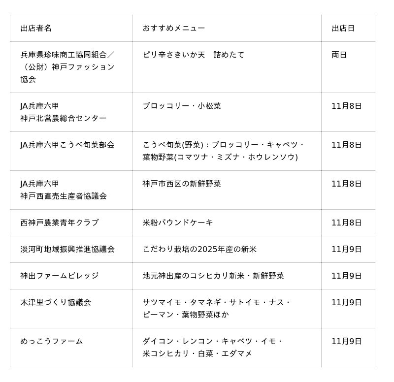 産地直送の新鮮な農産物が並ぶ物販ブースでは、地元農家の方々が丹精込めて育てた米や野菜などを販売します。生産者と直接会話を交わしながら、旬の食材を手に取って選ぶことができるのもこのイベントの魅力。神戸の旬の味覚との“おいしい出会いの場”を、ぜひお楽しみください。