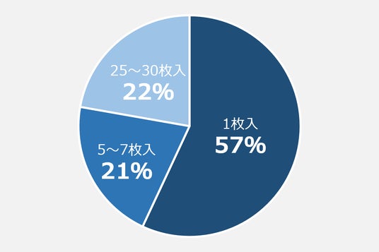 日頃使用しているシートマスクの枚数についての意識調査では1枚入57%と一番多い結果となりました。その理由として「まず試したい」「肌のコンディションに合わせて選びたい」「旅行やジムなど持ち運びたい」「人に贈りたい」などがありました。一方で枚数が増えるほど「毎日朝晩使いたい」「コスパ重視」などが挙げられています。