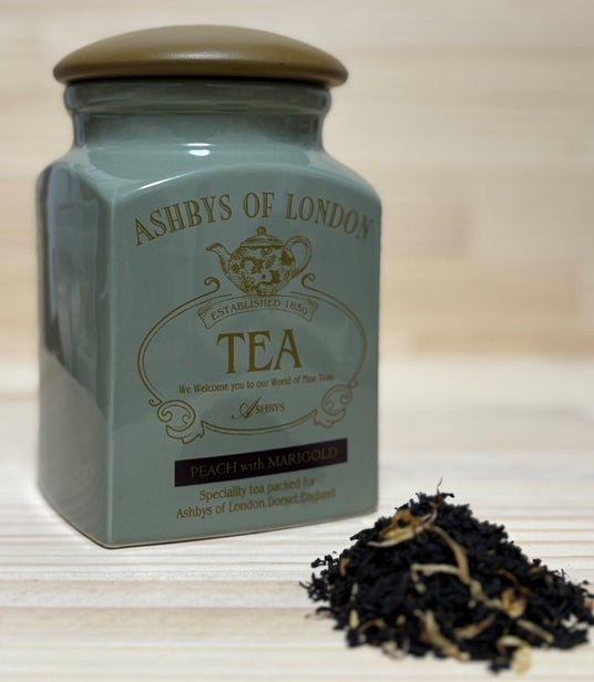 密封性の高い陶器製のキャディ入、ローズの花びら入りで甘みのある紅茶。