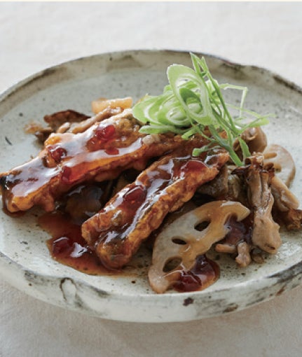 いとはん/さんまと舞茸の甘辛梅だれ秋の素材のさんまと舞茸とれんこんの組み合わせ。梅の風味がさんまの美味しさを引き立てます。