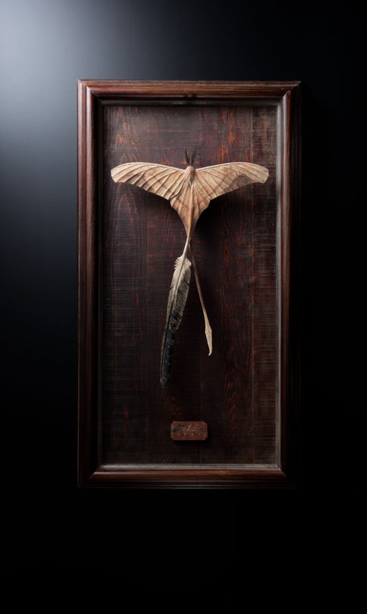 卒業制作で作成した「カラスの舟は昇華する」の作品や、アパレルブランドUNDERCOVERとのコラボレーション作品、「日本」をテーマにした時に作成した「JAPAN」の作品、大森氏の代表作である「ぬけない棘のエレファント」「ぬけない棘の狼」など棘をテーマにした作品などを、ベースモチーフとなる「蛾」に投影し、それぞれ表現した作品となります。