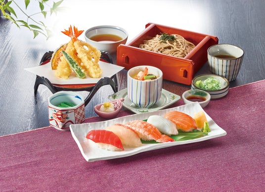 <寿司天ざるそば和膳【5貫】> 麺・天ぷら・寿司・茶わん蒸し・小鉢をセットにした「サガミのこだわり」を満喫できる商品です。