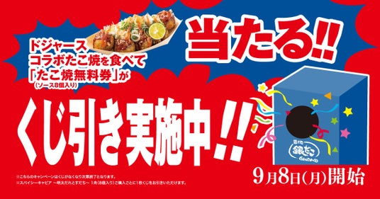 さらに、販売開始日と同日の2025年9月8日(月)より、ドジャースコラボ商品をご購入いただいたお客様を対象に、 「ぜったいうまい!!たこ焼1舟(ソース・8個入り)無料券」 が当たる 「くじ引きキャンペーン」 を開催いたします!