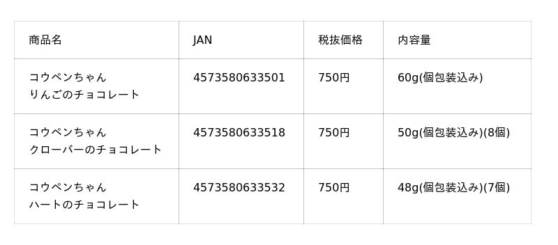 (左)コウペンちゃんりんごのチョコレート、(中央)コウペンちゃんクローバーのチョコレート、(右)コウペンちゃんハートのチョコレート