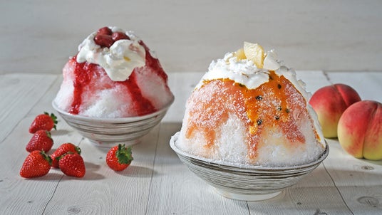 (右)桃とパッションフルーツのドルチェかき氷【ロイヤルパインズホテル浦和1Fペストリーショップ ラ・モーラ】