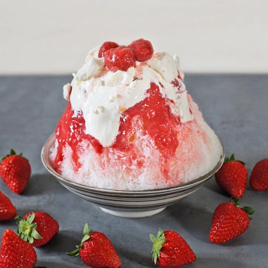 旬のみずみずしい桃を丸ごとシロップにし、氷の中には酸味の効いたパッションフルーツのディプロマットとフレッシュの桃がたっぷり。桃の芳醇な甘い香りとパッションフルーツの甘酸っぱい酸味のマリアージュを楽しむかき氷となっております。
