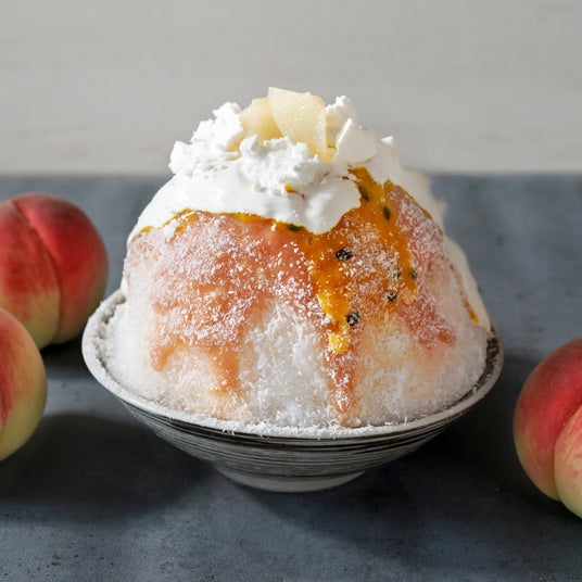 桃とパッションフルーツのドルチェかき氷旬のみずみずしい桃を丸ごとシロップにし、中には酸味の効いたパッションフルーツのディプロマットとフレッシュの桃をたっぷりと。桃の芳醇な甘い香りとパッションフルーツの甘酸っぱい酸味のマリアージュを楽しむかき氷