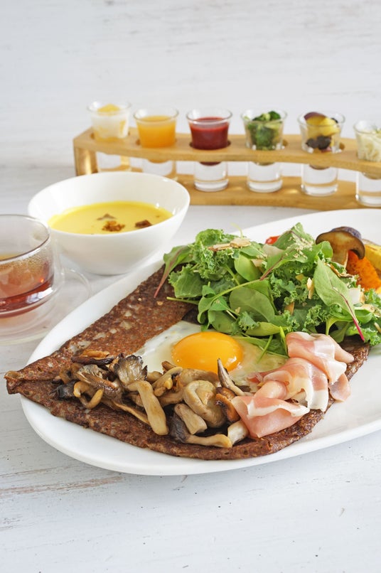 秋ガレットセット・ハーフ&ハーフ(キノコのソテーとトリュフ香るクリーム&スペイン産生ハム“ハモンセラーノ”)マルチバイタミングラス/かぼちゃのポタージュ/コーヒーor 紅茶 ※食材の組み合わせは一例です。