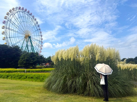 国営ひたち海浜公園の「大草原」周辺では、パンパスグラスが見頃を迎えました。大人の背丈をはるかに超える草丈に、羽毛のようにやわらかい花穂をつけます。ススキに似た草姿のパンパスグラスが風にそよぐ様子から、季節の移ろいを感じさせます。パンパスグラスの見頃は、9月下旬まで続く見込みです。