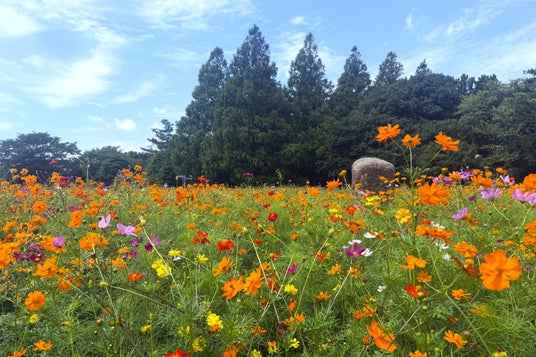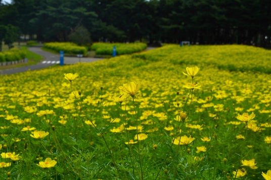 泉の広場フラワーガーデンでは、コスモス・キバナコスモスが見頃を迎えており、定番の赤、白、ピンクに加え、黄色やオレンジとカラフルな花畑をお楽しみいただけます。また、大草原フラワーガーデンではキバナコスモスの品種である”レモンブライト”も見頃を迎え、黄色い花がサイクリングコース沿い一面に広がる風景をご覧いただけます。