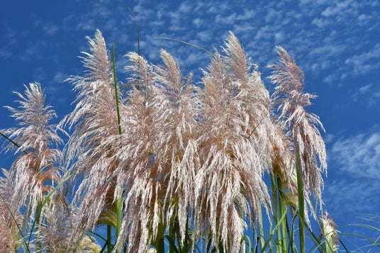 パンパスグラスはイネ科シロガネヨシ属の多年草で、南米(ブラジル・アルゼンチン)原産です。英名の「パンパスグラス」は、南米の大草原(パンパス)に生えている草(グラス)に由来。高さ2~3mと巨大な草丈から、別名「お化けススキ」とも呼ばれています。