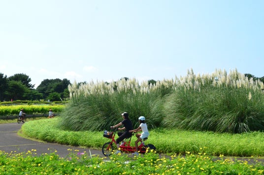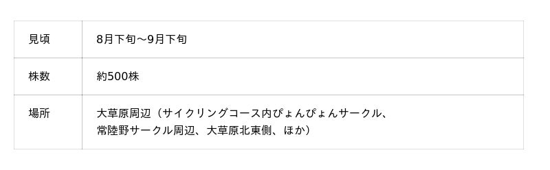 園内では「大草原」を中心とした3つのスポットに約500株植栽しています。サイクリングコースの「ぴょんぴょんサークル」と「常陸野サークル周辺」では、自転車に乗りながらサークル中心に位置する白銀の花穂をご覧いただけます。また、「大草原北東側」では桃色の花穂を付けるパンパスグラス(9月上旬に見頃予想)を間近でお楽しみいただけます。