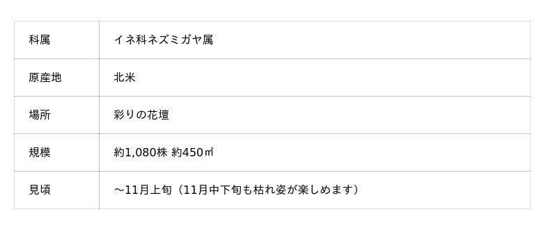 周囲の植物との相性も良く、10月下旬までは真ん丸真っ赤なもこもこコキアとともに彩り、11月上旬になると池の対岸のモミジバフウの紅葉とコラボレーションして秋の深まりを感じさせてくれます。