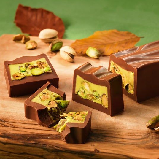 ナイフを入れるとピスタチオの粒がごろっと顔をのぞかせる、切り分けて食べるスタイルのチョコレート。深煎り・塩がけの2種類のピスタチオを香ばしくコク豊かなピスタチオクリームに詰め、ミルクチョコレートで包みました。鮮やかに映えるグリーンにはピスタチオのおいしさがぎっしり詰まっています。