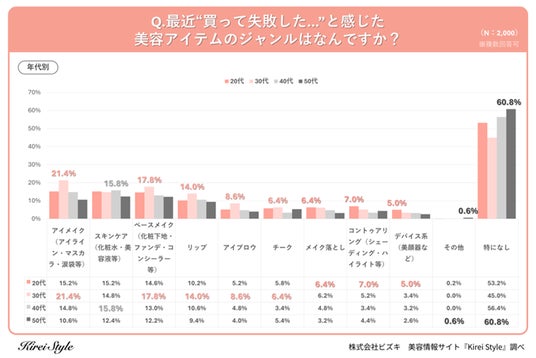 一方、50代では失敗したと感じるアイテムは「特になし」が60.8%という結果になり、自身の気に入った美容アイテムをリピート買いしている方が多いことが伺えました。