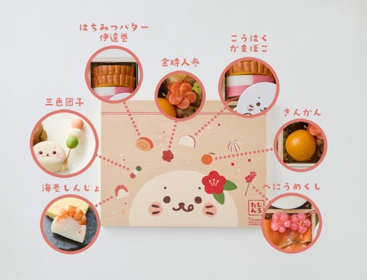 お重の蓋には、実際のおせち料理の品々をモチーフにしたイラストを散りばめた、本おせち限定のオリジナルデザインを採用しました。花飾りをつけたしろたんが、その料理を愛らしく舌を出して眺める、描き下ろしイラストです。