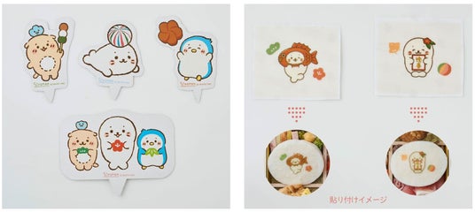 厚紙でできたオリジナルキャラクターピックと、蒲鉾に貼り付けて楽しめるオブラート状の可食イラストシートを付属しています。お好きな場所に配置して、自分好みのおせちにデコレーションをしていただけます。