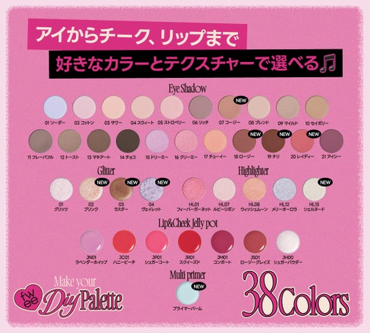 中身は、アイシャドウ・グリッター・ハイライター・リップアンドチーク・アイプライマーの5カテゴリー、全38色で構成。