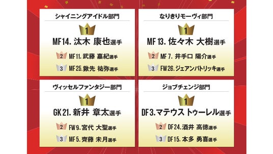シャイニングアイドル部門は、汰木康也選手が栄えある1位に輝き、イケメン総選挙からの連覇を重ね、圧巻の3連覇を達成しました。なりきりモーヴィ部門では、佐々木大樹選手が昨年のイケメン総選挙(神戸観光大使部門)に続き、首位を獲得。ヴィッセルファンタジー部門では、”海神アーライ”として強烈な印象を残した新井章太選手が初優勝を飾りました。そして、ジョブチェンジ部門の頂点には、凛々しい警察官姿を披露したマテウス トゥーレル選手が立ちました。