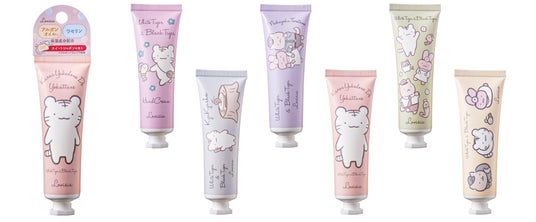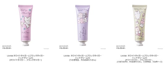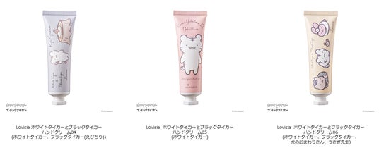 『Lovisia ホワイトタイガーとブラックタイガー ハンドクリーム』では、ホワイトタイガーとブラックタイガーのほか、ちょっとしたことで料理になってしまうブラックタイガーをいつでも迅速に診察・治療する名医のうさぎ先生や、ホワイトタイガーたちの住む町の安全を守る犬のおまわりさん、どろぼうねずみも登場。「とらえび」ファンにはマストハブなアイテムとなっています。