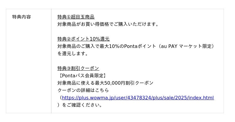 また、Pontaパス会員なら、三太郎の日やPontaパス ポイントUPセレクトなどau PAY マーケットの4大特典がパワーアップする「Pontaパス1周年 4大特典キャンペーン」を2025年10月3日から開催しています。詳しくはこちら(https://wowma.jp/feature/pontapass-anniversary