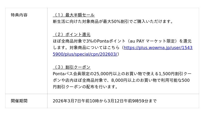 本キャンペーンでは、物価高騰が続く中での新生活準備を支援するため、家電や生活雑貨なども取り扱う「XPRICE au PAY マーケット店」で、人気のブランド家電を対象とした最大半額セールやおトクなポイント還元を実施します。さらに、年度末の需要に合わせ、旬の味覚をお届けする「ご当地風土」では、旬のみかんやお米、お肉、海鮮などが最大50%割引になる割引セールやポイント還元を同時開催します。