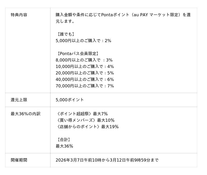 さらに、ポイント超超祭の特典として、購入金額に応じて最大7%のPontaポイント(au PAY マーケット限定)を還元し、店舗からの特典や買い得メンバーズの特典をあわせると最大36%還元となります。