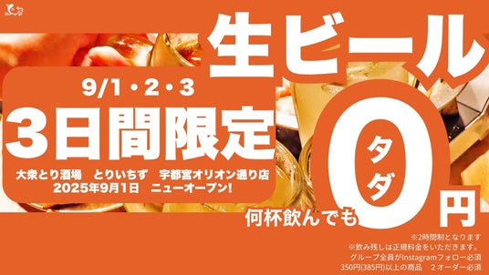 【大衆とり酒場 とりいちず 宇都宮オリオン通り店】が2025年9月1日(月)、駅近の好立地にグランドオープンいたします。
