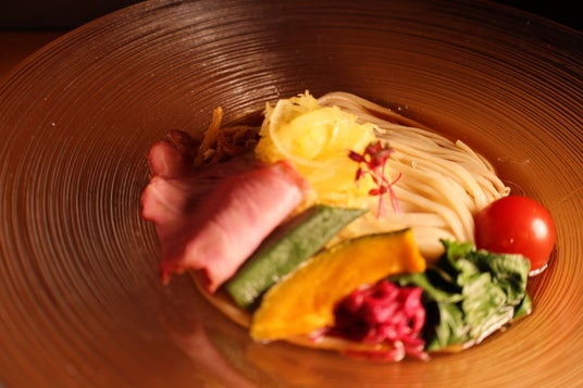 丁寧に抽出した煮干しと昆布のだしが香る、旨み凝縮の冷製らぁ麺です。夏の暑さを和らげるすっきりとした味わいに、つるりと喉越しの良い自家製平打ち麺。瑞々しい季節野菜とともに、和の上品さを感じる一杯に仕上げました。食べ終わった後の涼やかさまでご堪能ください。