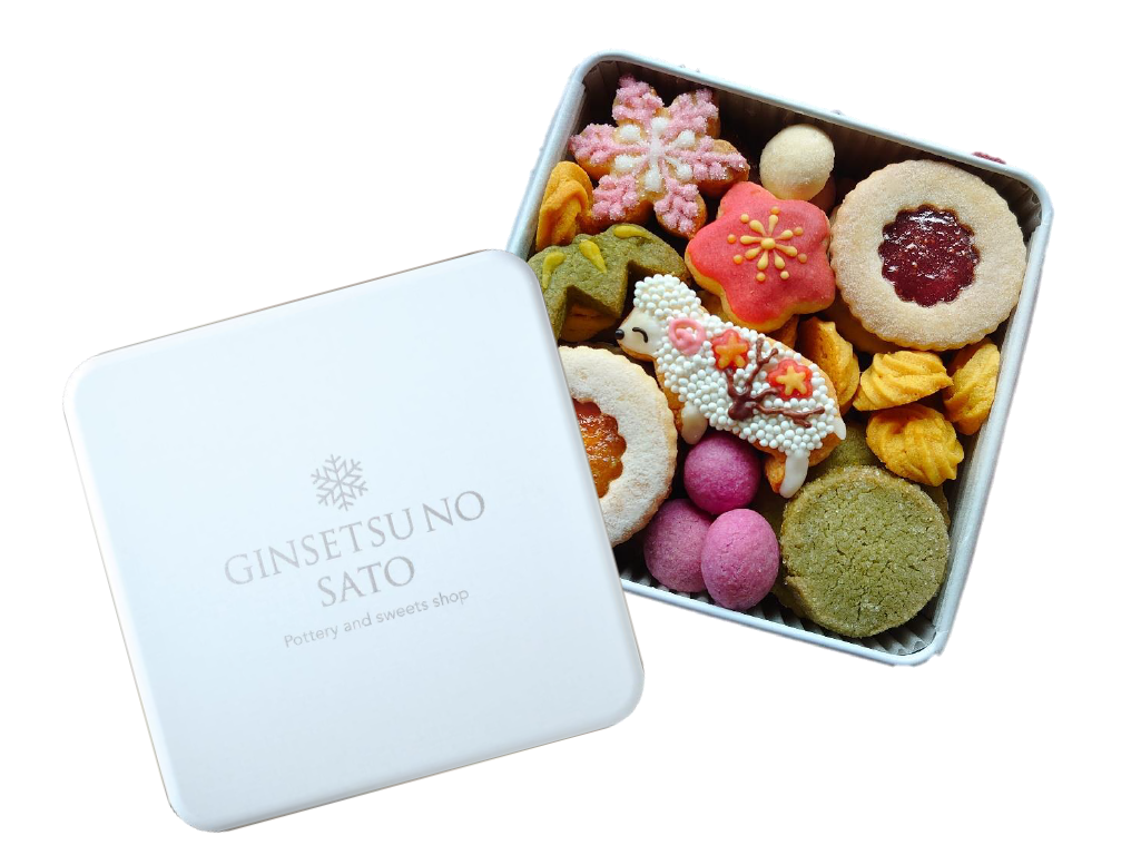 奈良県の陶芸作家が手掛けるクッキー缶。開けるとまるで宝石箱のよう。愛らしいひつじやいちごと柚子のフルーツサンドクッキーなど彩り豊かなクッキーを詰め合わせました。