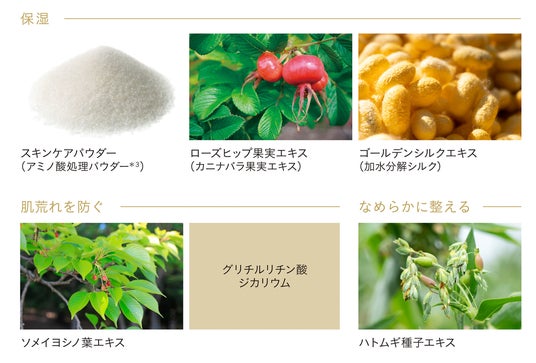 *1 メイクアップ効果 *2 従来品と比較 *3 パルミトイルプロリン、パルミトイルサルコシンNa、パルミトイルグルタミン酸Mg、水酸化Al、パルミチン酸、マイカ *4 ホホバ種子油、スクワラン(オリーブ由来)、シア脂油<保湿成分>*5 シソ種子油、アルガニアスピノサ核油、クランベリー種子油、ククイナッツ油<保湿成分>