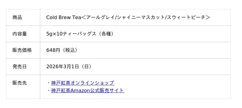 神戸紅茶株式会社(本社:兵庫県神戸市東灘区住吉浜町、社長:丸山 輝真)は、3月1日(日)より水出し紅茶『Cold Brew Tea』を数量限定で販売を開始します。