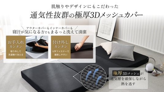 寝汗や湿気、ニオイを抑える「竹炭配合ウレタン」を使用し、消臭・調湿・抗菌のトリプル効果を発揮します。さらに、極厚3Dメッシュカバーが湿気を外へ逃がし、ムレを防止。カバーは着脱して丸洗いできるため、いつでも清潔に保てます。寝汗が気になる方や、年中快適に眠りたい方にも最適な、通気性と清潔さを両立した仕様です。
