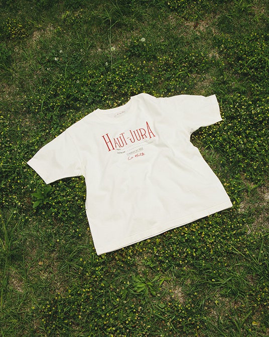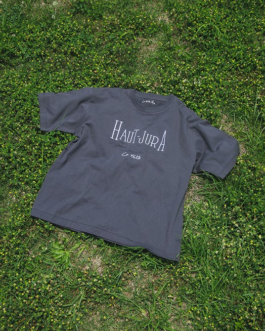 フランスとスイスの国境にあるジュラ山脈一帯を指す地名を刺繍し、プリントと組み合わせた繊細なロゴTシャツになっています。