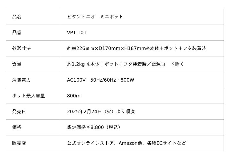 この度、ビタントニオは、小型で場所を取らず火を使わないから、いつものテーブルに置いて調理と食事が「動画を見ながら、仕事をしながら、おしゃべりしながら」楽しめるミニポットを、 2026年2月24日(火)より、公式オンラインストア、Amazon他、各種ECサイトなどにて順次発売いたします。