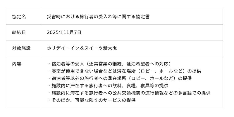 クリアル株式会社(本社:東京都港区、代表取締役社長 執行役員 CEO:横田 大造、以下「当社」)は、グループ会社のクリアルホテルズ株式会社(東京都港区、代表取締役 倉地 恵太、以下「クリアルホテルズ」)及びステイシー新大阪合同会社が運営に携わる「ホリデイ・イン&スイーツ新大阪」を対象に、大阪府・大阪市と「災害時における旅行者の受入れ等に関する協定書」(以下、「本協定」)を締結したことをお知らせいたします。