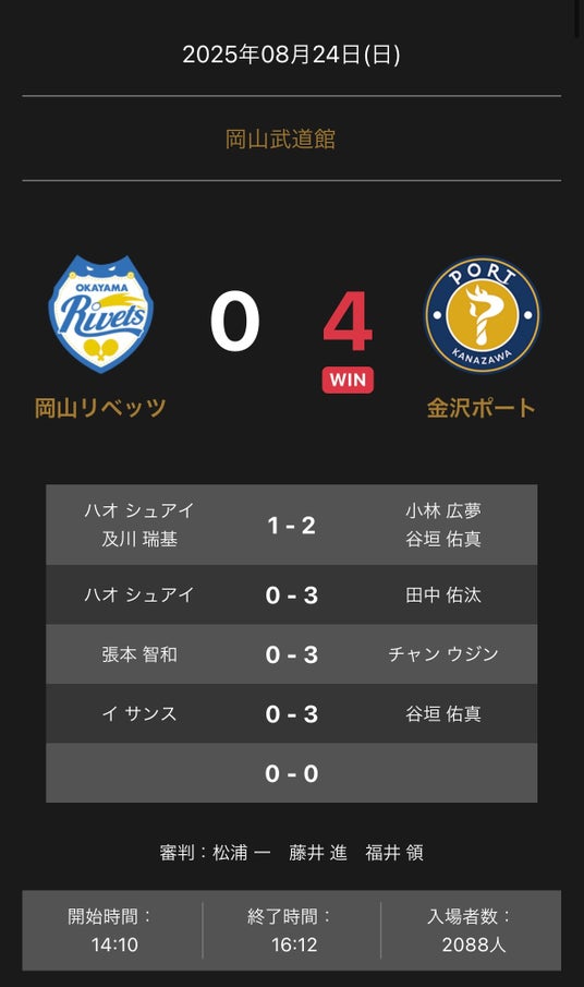 ノジマTリーグ2025-2026シーズン 公式戦 8月24日開催 岡山リベッツvs金沢ポートの試合は0-4で金沢ポートが勝利しました。