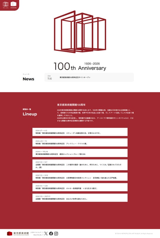 また、100周年記念事業の内容や100年の歴史を振り返る100周年記念特設サイトの公開に先立ちティザーウェブサイトを開設し、2026年 展覧会ラインナップを公開しています。