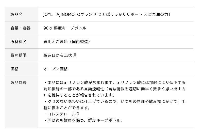 JOYL「AJINOMOTOブランド ことばうっかりサポート えごま油の力」を2月20日(金曜日)より全国で順次発売します。