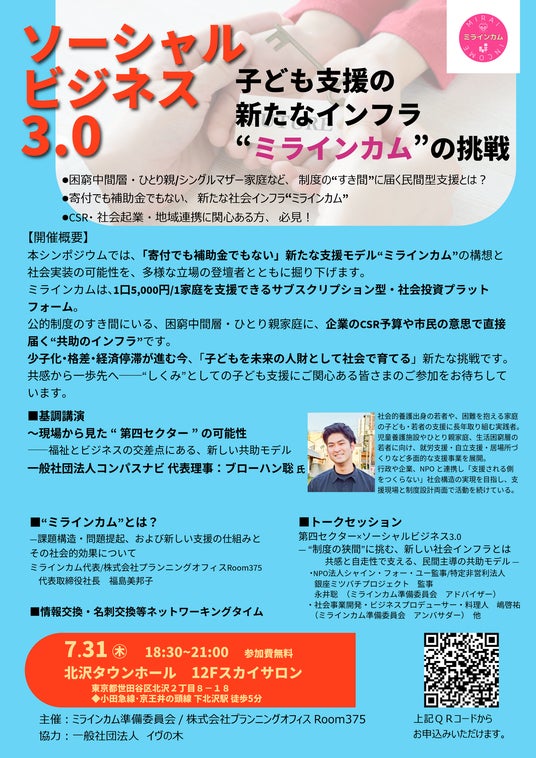 (株)プランニングオフィスRoom375(本社:東京都世田谷区 代表取締役社長:福島美邦子は、シンポジウム『ソーシャルビジネス3.0』 ― 子ども支援の新たなインフラ「ミラインカム」の挑戦 ―を2025年7月31日に開催します。