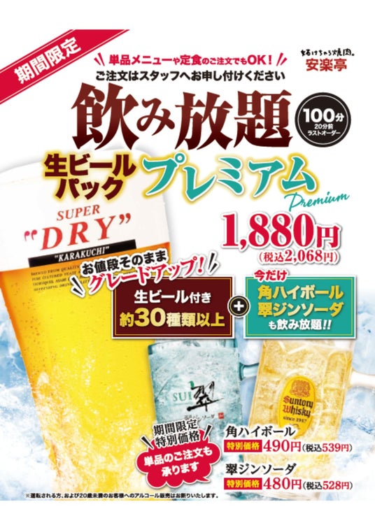 株式会社安楽亭(本社:埼玉県さいたま市、)は、2025年7月1日より期間限定人気の飲み放題プランをお値段そのままでグレードアップ!「プレミアム飲み放題フェア」を開催いたします。