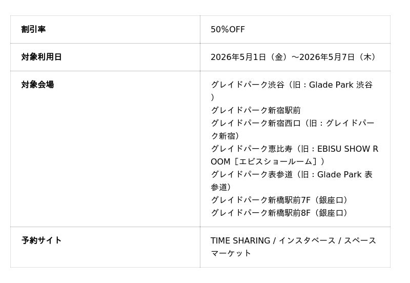 旅行費や外食費の上昇が続く中、2026年のゴールデンウィークは、遠出や宿泊を伴うレジャーに代わる選択肢として、当社では近場で過ごすニーズへの関心が高まる可能性があると見ています。こうした背景を受け、TIME SHARINGでは2026年5月1日(金)から5月7日(木)までの期間、都内7会場を対象に割引キャンペーンを展開します。