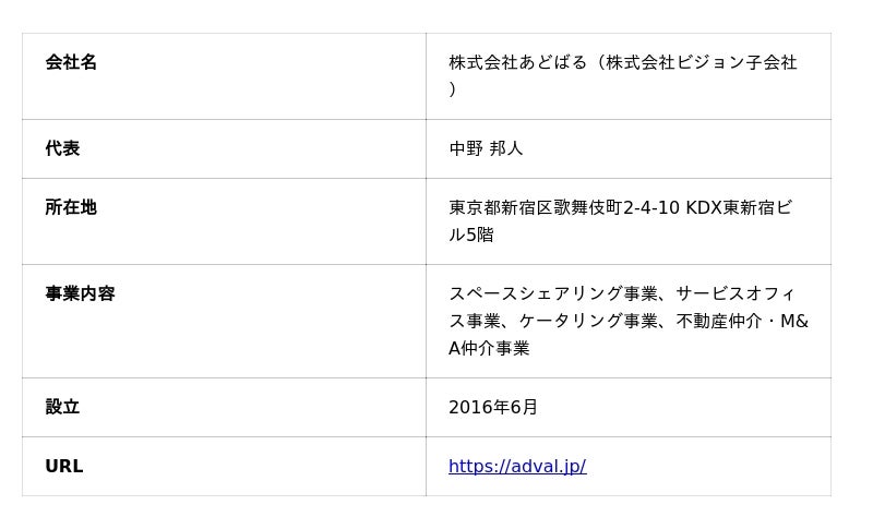 株式会社あどばるは、スペースシェアリング事業を中心に、サービスオフィス事業、ケータリング事業、不動産仲介・M&A仲介事業などを展開しています。遊休不動産の活用を通じて、多様な利用目的に応じた場の提供を行っています。
