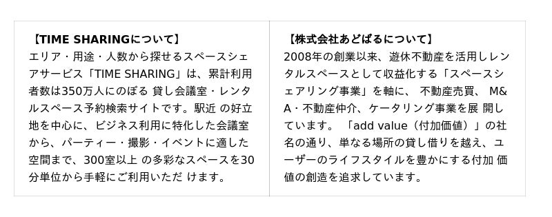 株式会社あどばる(所在地:東京都新宿区、代表取締役:中野邦人)は、2026年のゴールデンウィークに合わせ、スペースシェアリングサービス「TIME SHARING」にて、都内に位置する人気パーティー会場のスペース料金(1時間あたり)を50%OFFで提供するキャンペーンを実施します。