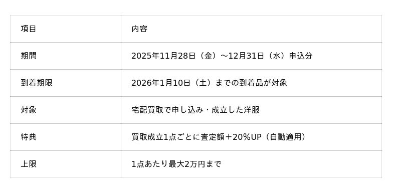 本施策は、対象期間内に宅配買取で査定が成立した洋服1点ごとに、査定額+20%増額を自動適用するもの。