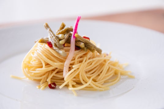 (材料)パスタ…100g、オリーブオイル…少々、 にんにく…少々、鷹の爪…少々、酒…少々、 みりん…少々、薄口醤油…少々、塩…少々 (作り方)1.塩を加えたお湯でパスタを茹でる。 2.フライパンにオリーブオイルを熱し、にんにく のみじん切りと鷹の爪を加え香りを出す。3.酒・ みりん・醤油を加え塩で味を調える。最後にピク ルスをトッピング。(注)甘くなりやすいので、みりんの入れすぎにご注意。