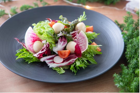 (材料)サニーレタス…適量、 フリルレタス…適量、ミニトマ ト…適量、ラディッシュ…適量、紅芯大根…適量