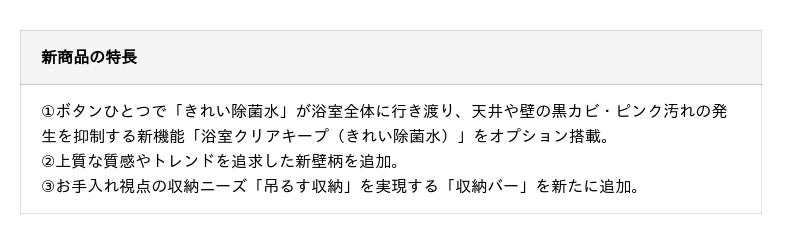 ボタンひとつで浴室全体の黒カビ・ピンク汚れを抑制する新機能~戸建住宅・マンション向け浴室商品主要シリーズに~