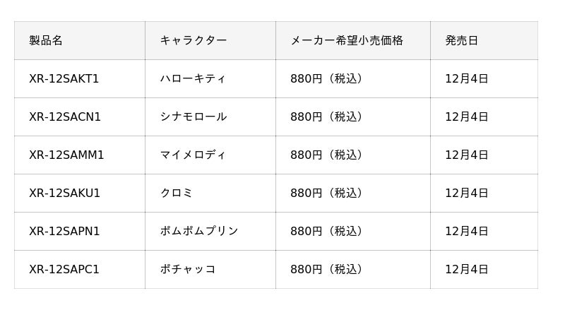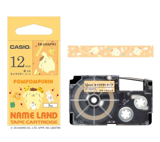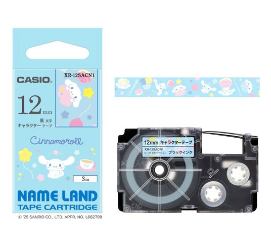 また、「サンリオ」の6キャラクター「ハローキティ」、「シナモロール」「マイメロディ」、「クロミ」、「ポムポムプリン」、「ポチャッコ」のネームランドテープ『XR-12SA』(6種)も併せて発売します。テープは、それぞれのキャラクターをイメージしたカラーとマッチした色合いに仕上げました。お名前付けや整理収納に便利な12mm幅のテープを採用し、ネームランドの全モデルで使用可能です。
